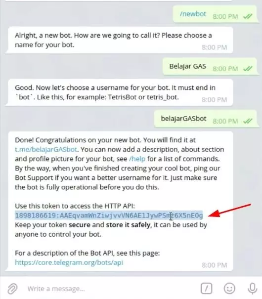 Jika semua berhasil, kamu akan mendapatkan token bot untuk dijadikan handle (pegangan) pada proses pembuatan bot.