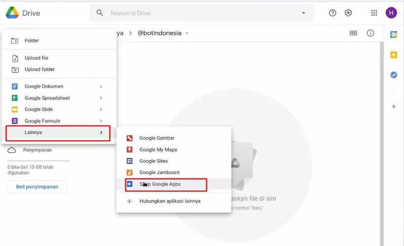 Buka Google Drive, pilih Baru, Lainnya, kemudian pilih Google Apps Script