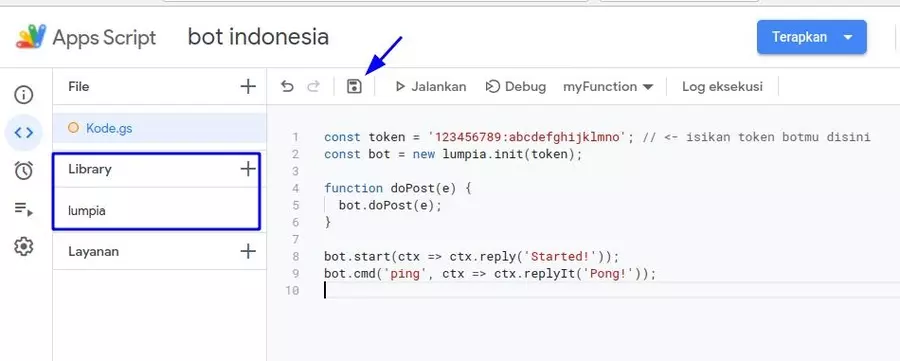Untuk bisa menjalankan sebuah bot, butuh token bot yang di dapat dari bot father. Jika belum punya silakan membuat dahulu, bisa diperiksa pada halaman pembuatan token bot